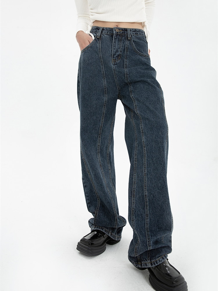 Dark Blue Womens Jeans High Waist Vintage Straight Baggy Denim Pants Streetwear American Style Fashion Wide Leg Denim Trouser