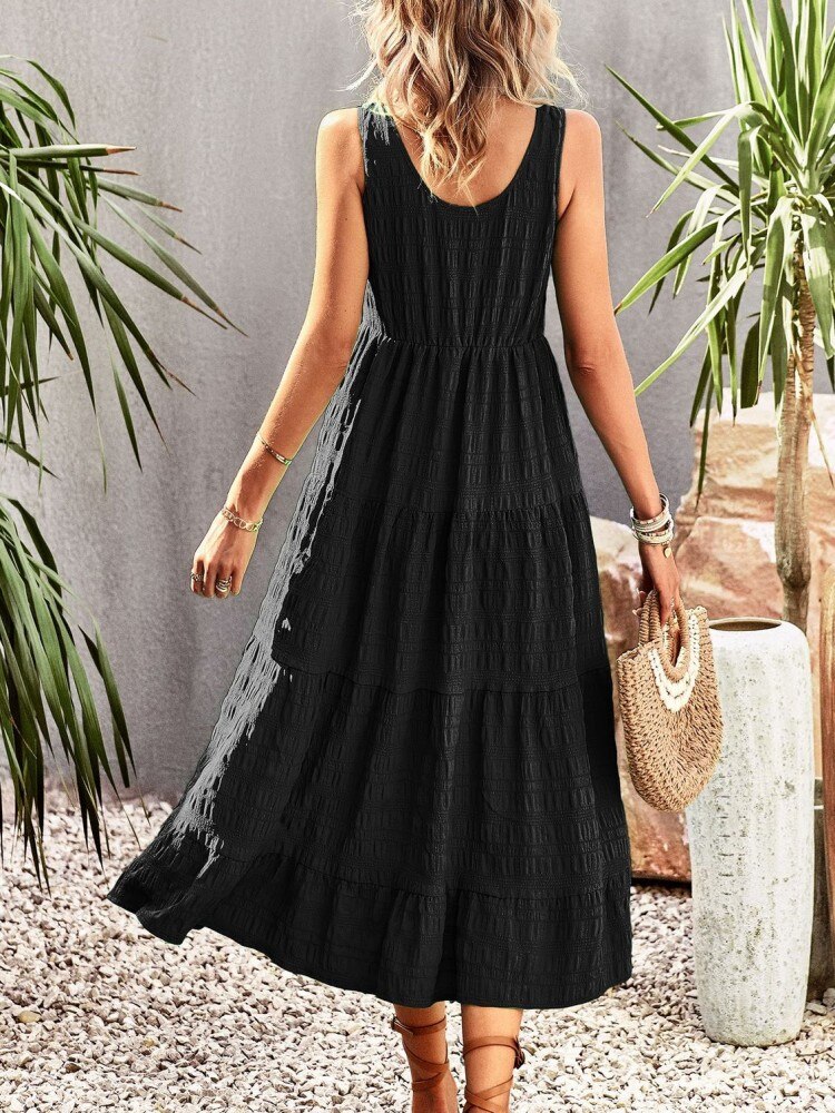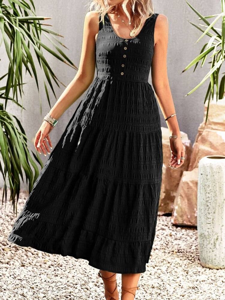 Chic A-line Sleeveless Ruffles Pocket Summer Dress For Women Elegant O-neck Button White Dress Ladies Beach Holiday Sundresses